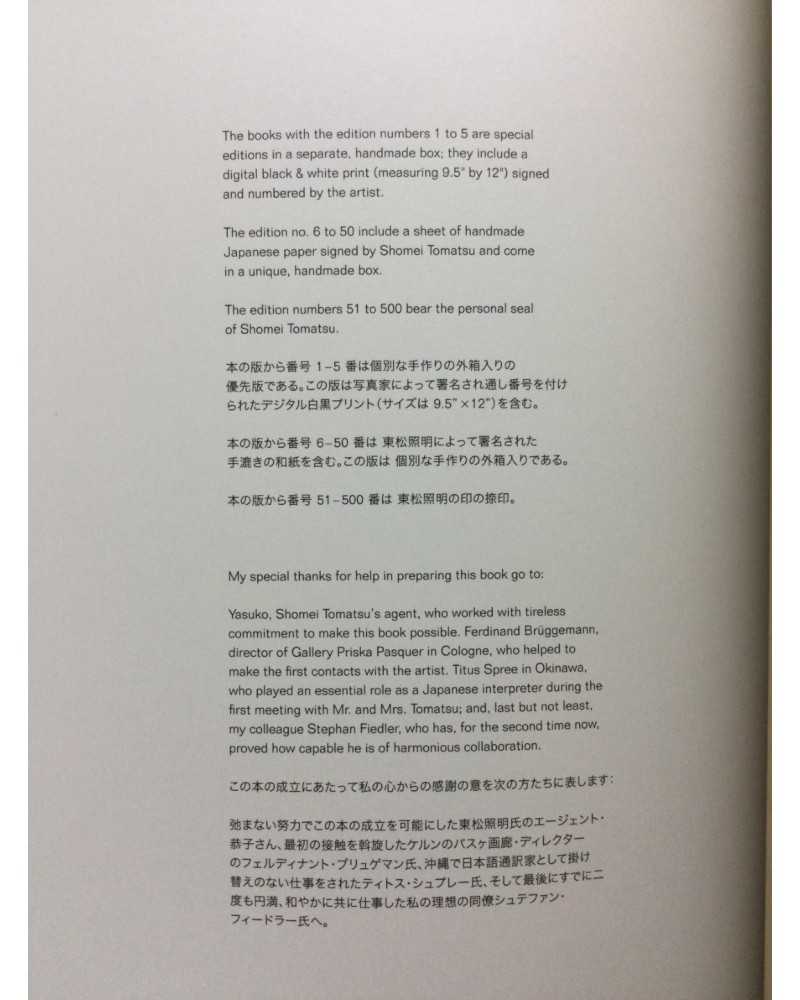 First edition limited to 500 copies. Number 47/500. The edition number 6 to 50 include a sheet of handmade Japanese paper signed by Shomei Tomatsu and come in a unique handmade box. Hardcover photobook. In fine condition.
